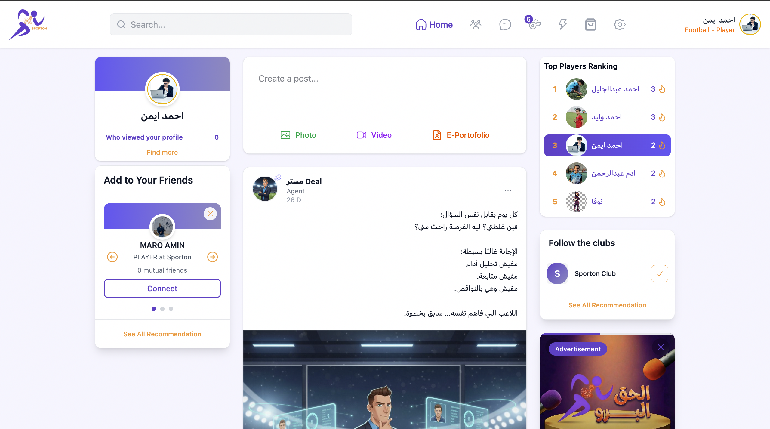 منصة تواصل اجتماعي للرياضيين شبيهة بـ LinkedIn، مبنية كـ Monorepo وتضم عدة تطبيقات تخدم المستخدمين والإدارة والتحليلات والتسويق.